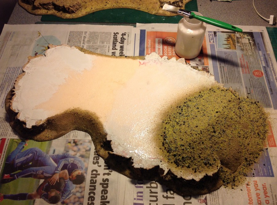 PVA – Now slap your PVA glue onto everywhere that you want texture and pour over your sand/gravel mix. As pictured you will need to do this on top of newspaper not just to stop your table being PVA’d but also so you can easily scoot any excess sand/gravel back into its container. Again leave this overnight to dry!